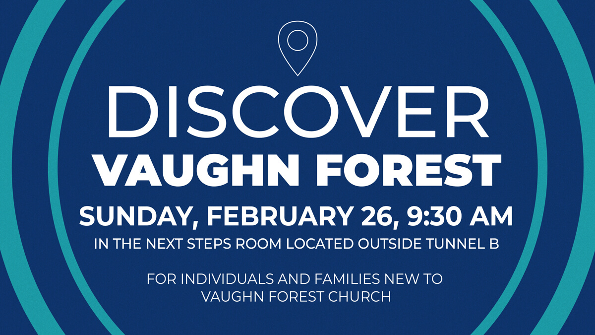 If you are new to Vaughn Forest and are wanting to learn a little bit more about our church, then we invite you to join us for Discover Vaughn Forest on Sunday, February 26, at 9:30 AM in the Next Steps Room. Snacks are provided and childcare is available through our Kids Ministry.