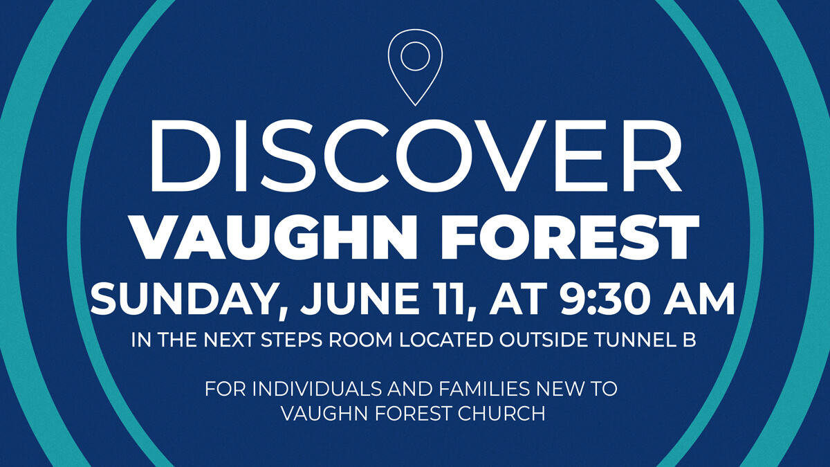 If you are new to Vaughn Forest and are wanting to learn a little bit more about our church, then we invite you to join us for Discover Vaughn Forest on Sunday, June 11, at 9:30 AM in the Next Steps Room. Snacks are provided and childcare is available through our Kids Ministry.