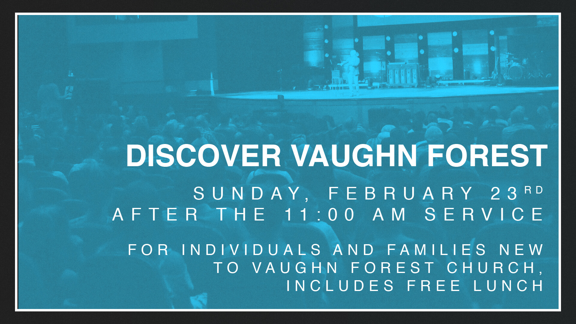 If you are new to Vaughn Forest, then we invite you to join us for Discover Vaughn Forest on Sunday, August 28, after the 11 AM service. You will be able to meet our pastors and staff and learn more about VFC. A free lunch is provided and childcare is available. To register for Discover Vaughn Forest, click here.