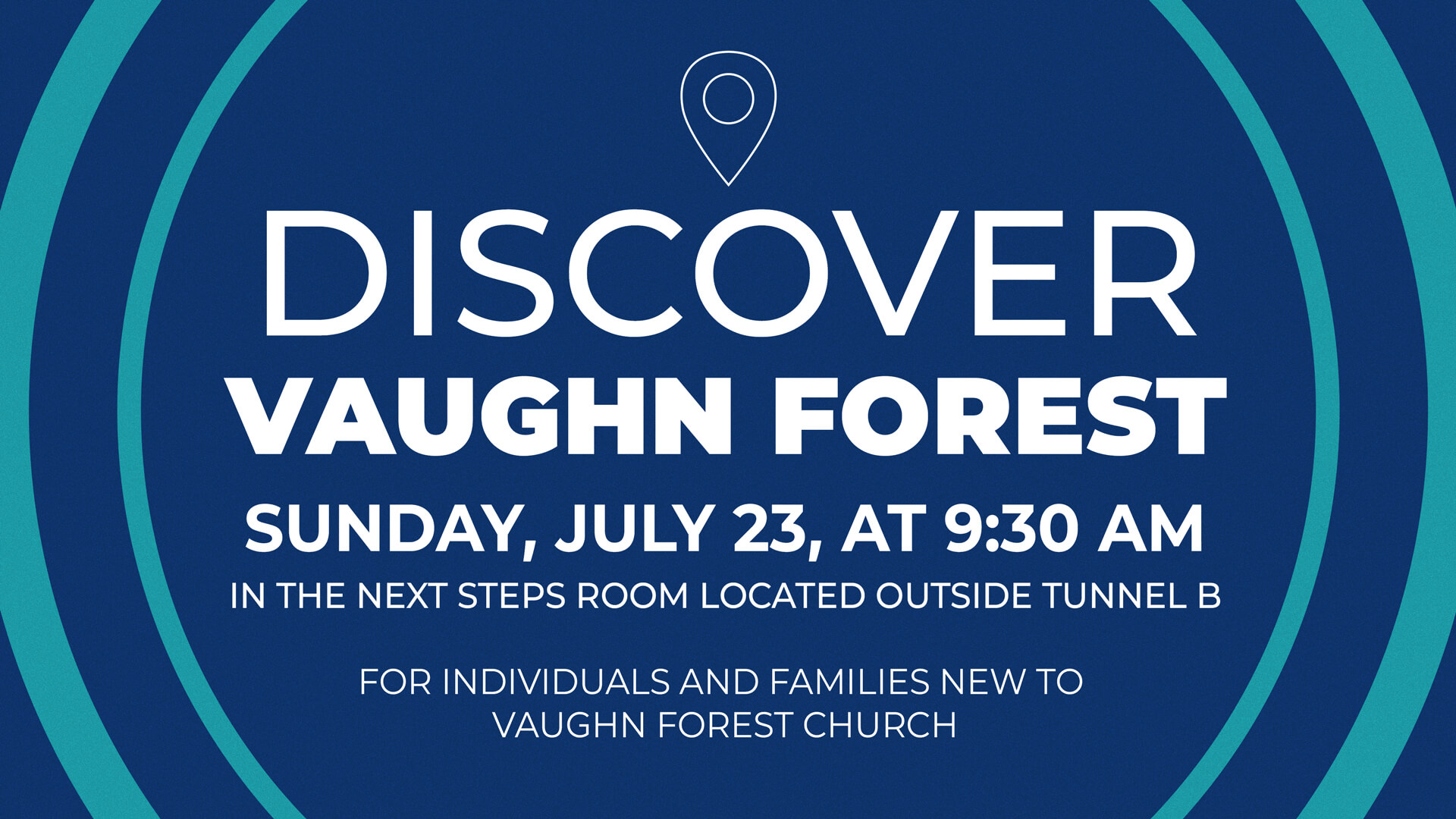 If you are new to Vaughn Forest and are wanting to learn a little bit more about our church, then we invite you to join us for Discover Vaughn Forest on Sunday, July 23, at 9:30 AM in the Next Steps Room. Snacks are provided and childcare is available through our Kids Ministry.