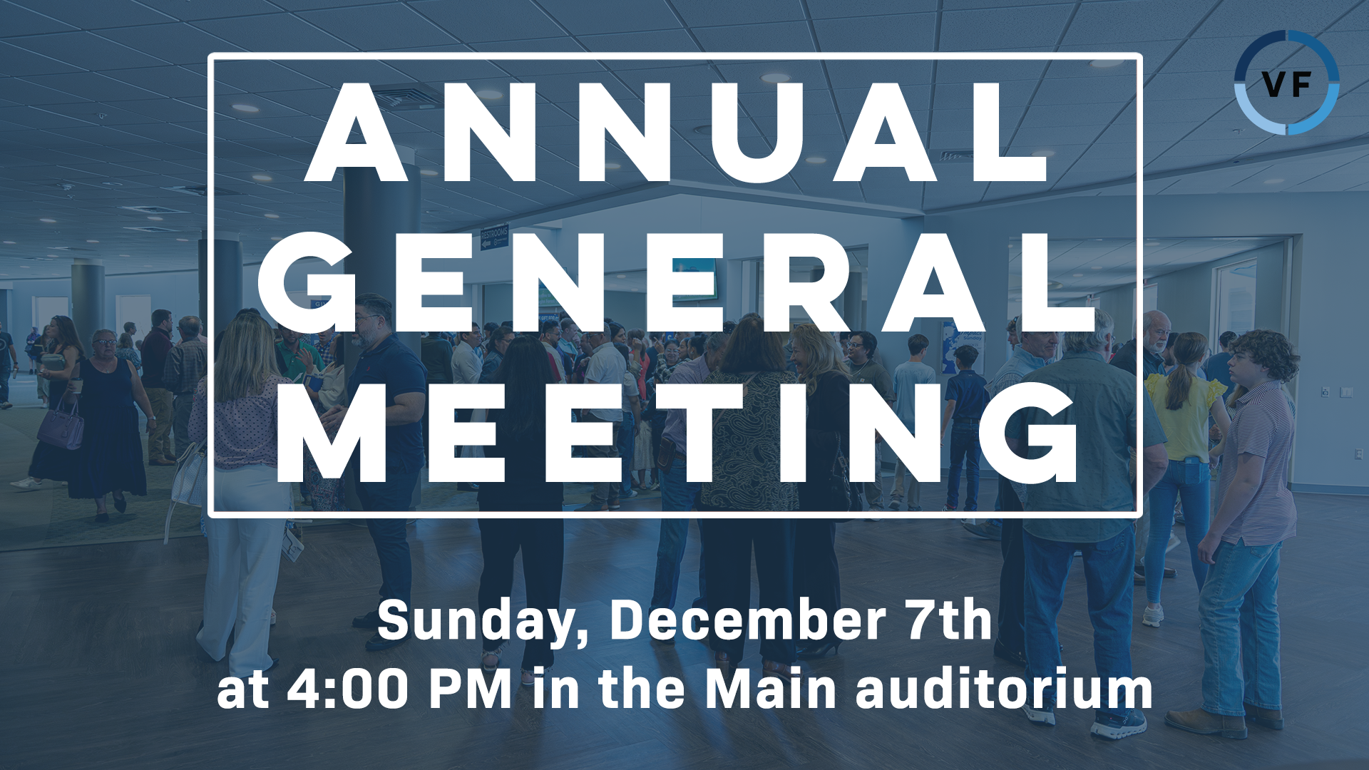 Vaughn Forest Church 8660 Vaughn Road, Montgomery, AL, United StatesAll VFC Members are invited to join us on Sunday, December 7, at 4:00 PM in the Main Auditorium for our Annual General Meeting. We will go over next year’s budget, hear from Pastor Jim, and celebrate all that God has done through VFC in 2025.